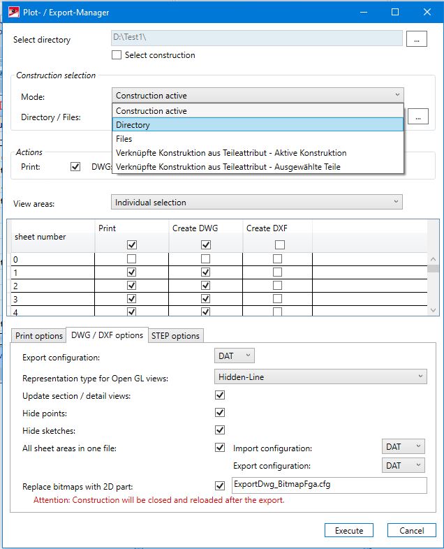 • Simultaneous printing and export in DWG, DXF or STEP Print / export of all or selected sheet-areas